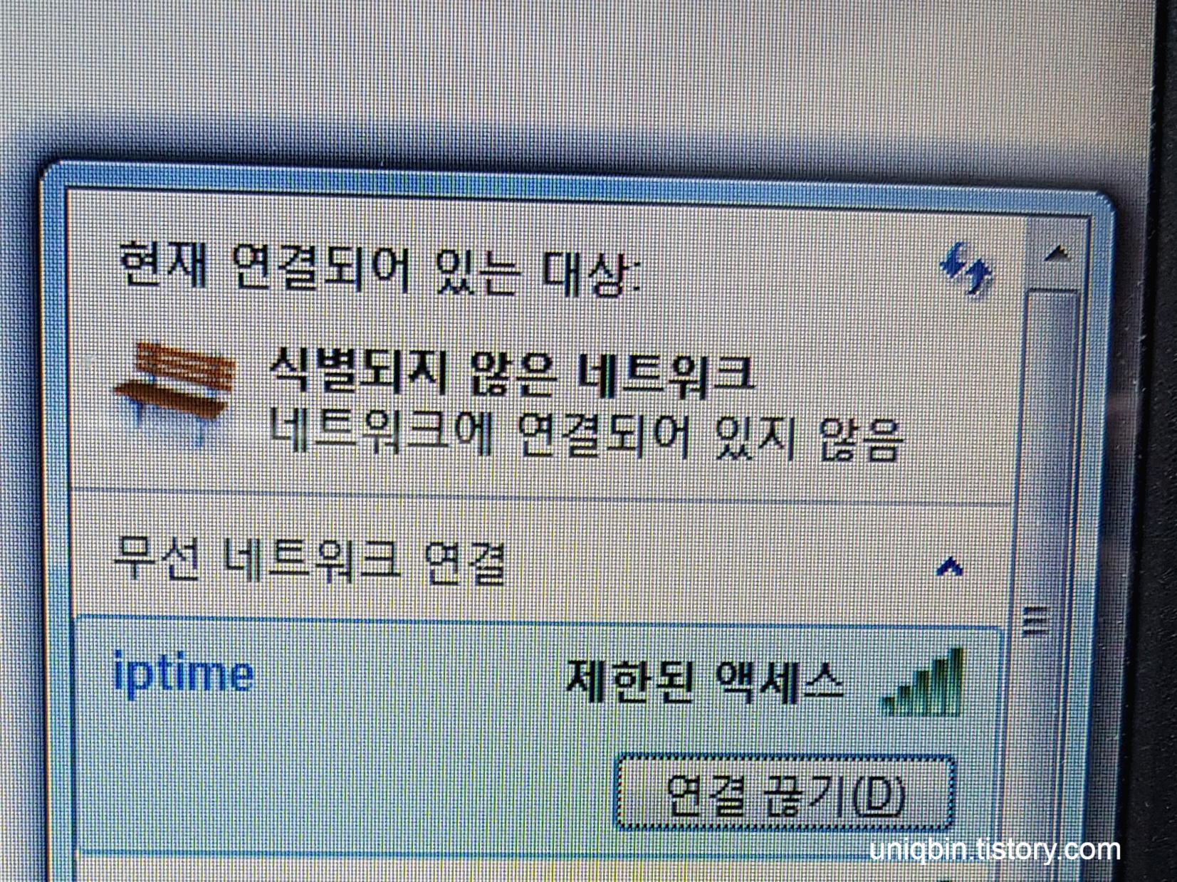 노트북에서도 iptime으로 뜹니다. 근데 연결끊기가 뜨니 연결된것 같지만 두번째 사진을 보시면 느낌표가 뜨다보니, 사실은 안된거라서