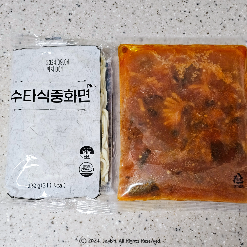 수타식 중화면 2개와 고추짬뽕이 들어있어요.