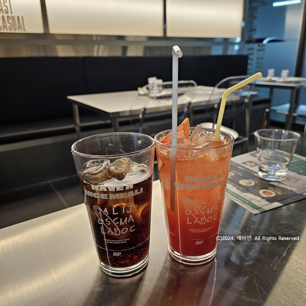 음료는 콜라와 자몽에이드를 시키고. 참고로 자몽에이드는 그 옛날 색색 음료수 아시나요? 딱 그맛ㅋ