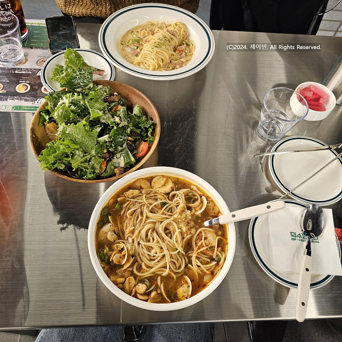 머쉬룸크림파스타와 땡초파스타를 고민하다가 저희 둘다 매운걸 좋아해서 마초파스타랑 땡초파스타 남편의 어필로 덕수 샐러드도 시켰어요.