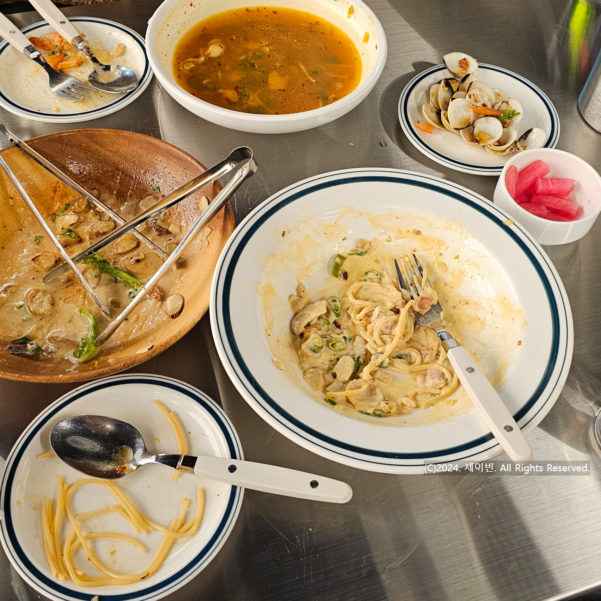 근데 전 오직 크림이거나 크림 봉골레 파라서.. 크림이 안든 봉골레는 그냥 면만 먹는맛 느낌때문에 남편에게 토스했는데 남편은 역시 본인픽이라 그런지 진짜 세상맛있게 냠냠.