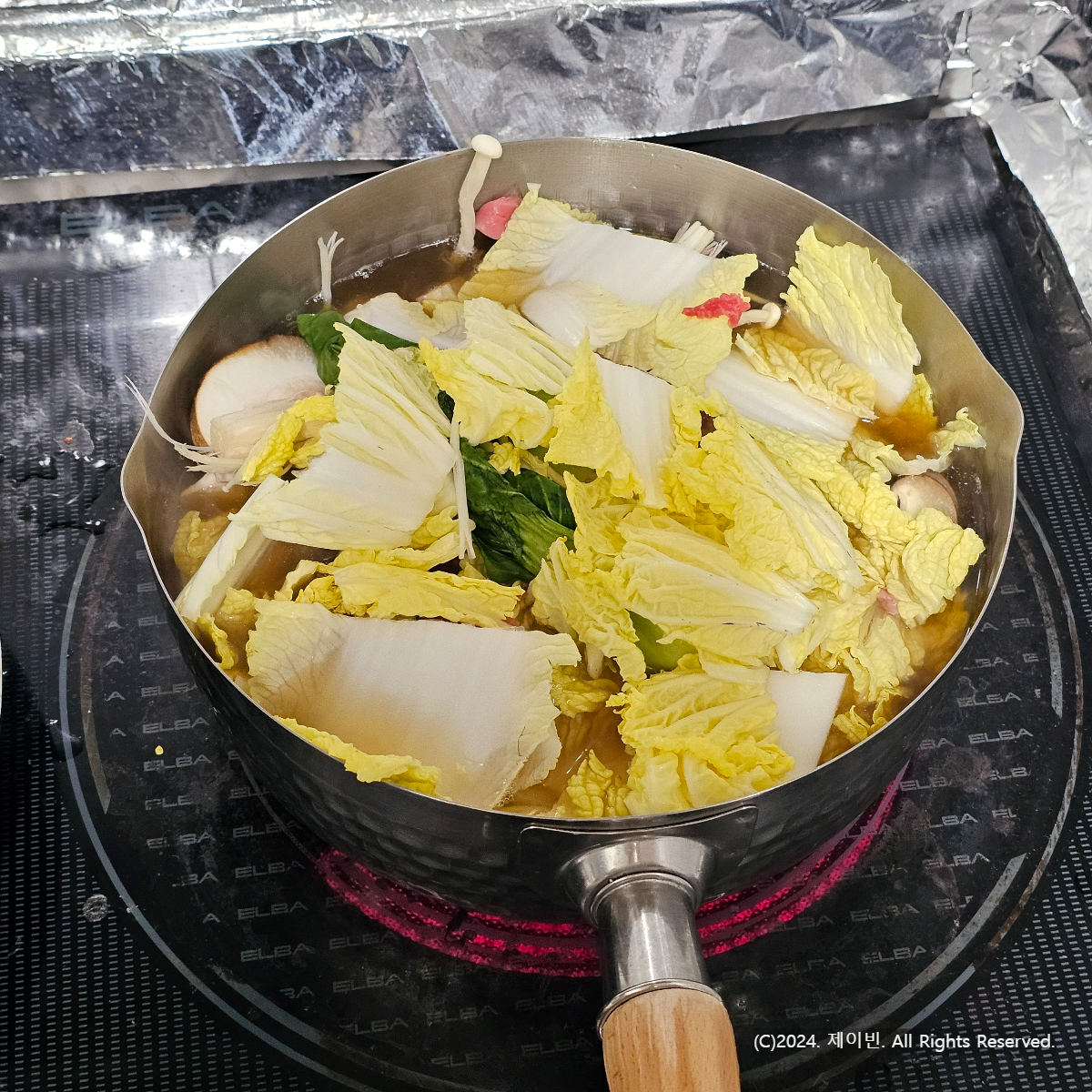 물 1.2리터를 소스 넣고 끓이다가 채소를 가득 넣었는데 이왕이면 배추랑 버섯들이 집에 더 사둔게 있으면 좋을 것 같아요.