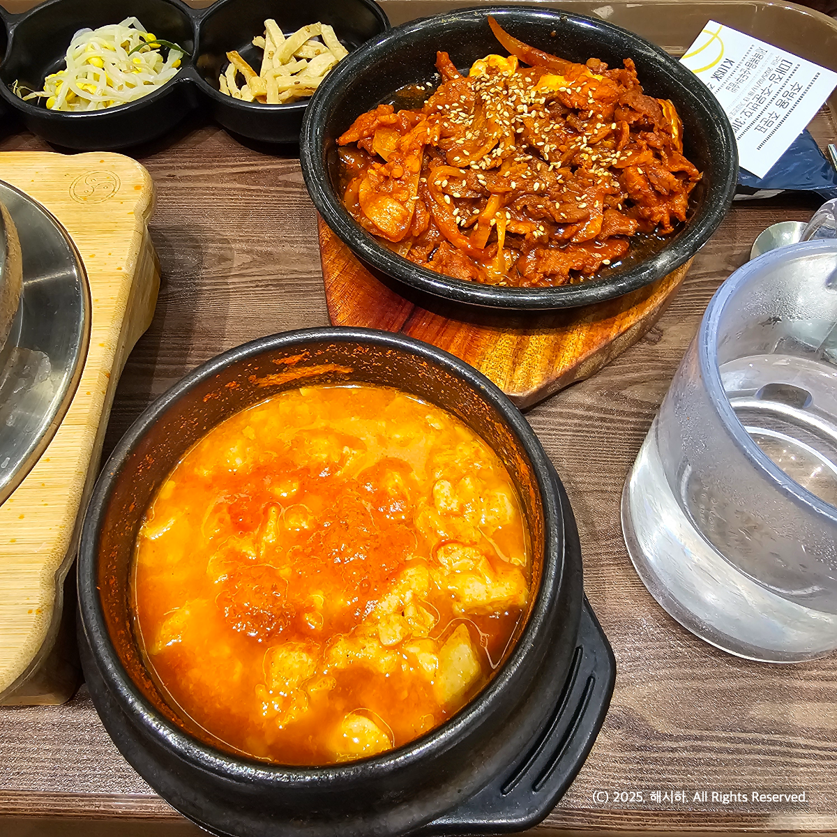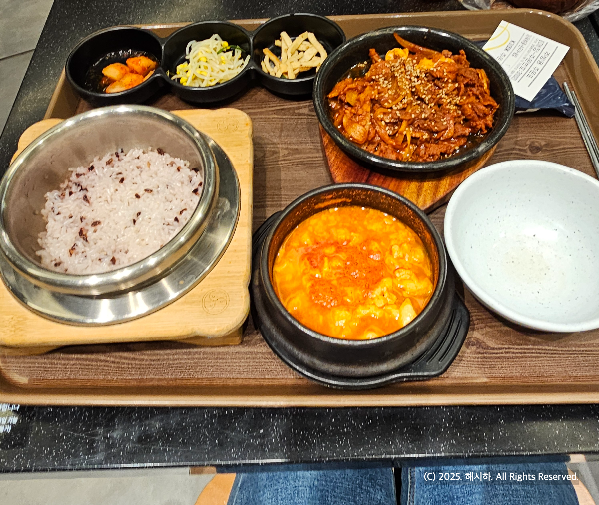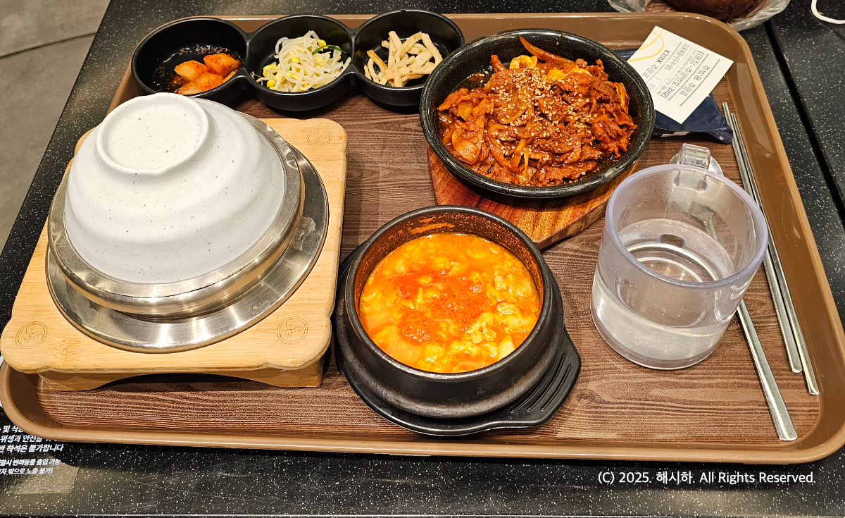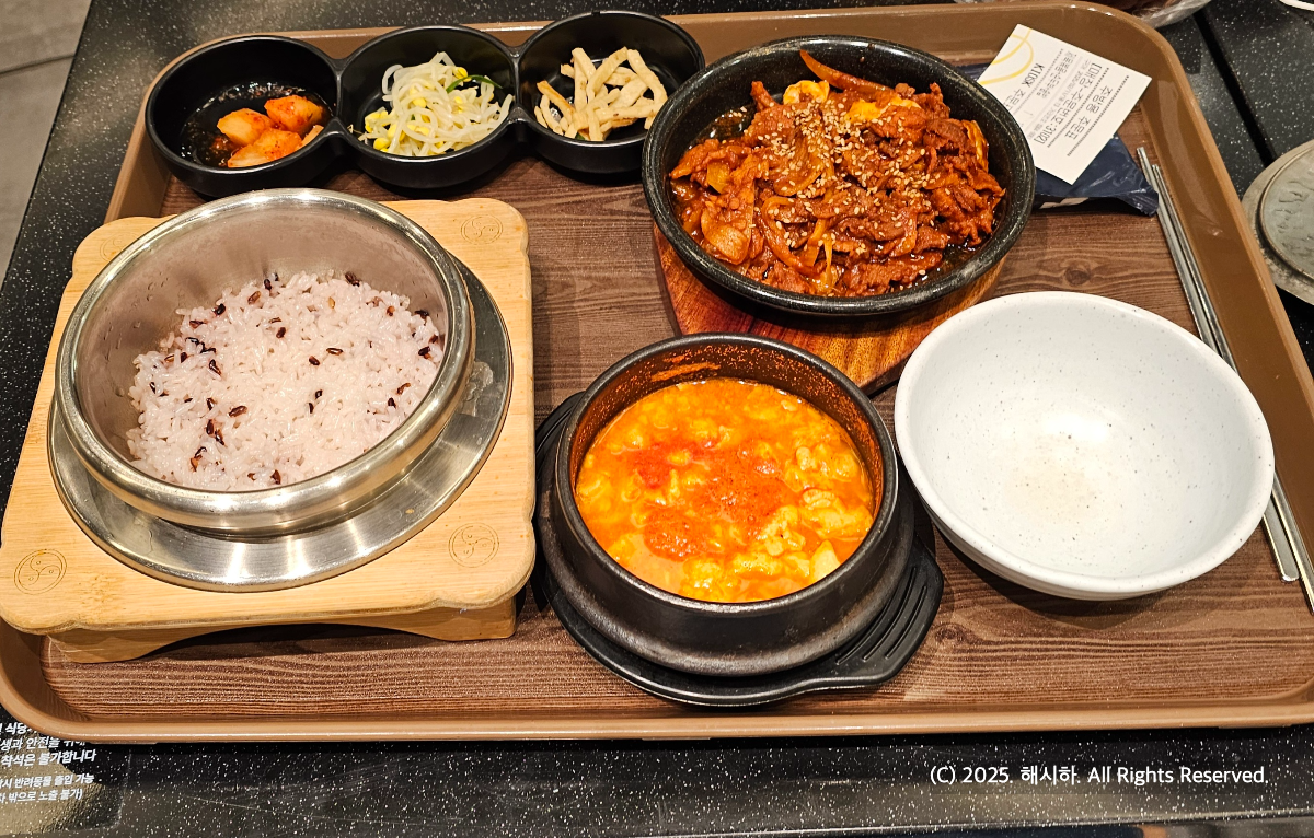 메뉴판 찍는걸 깜빡했지만 저는 순두부 제육 솥밥 한상 16000원짜릴 시켜먹었어요.
