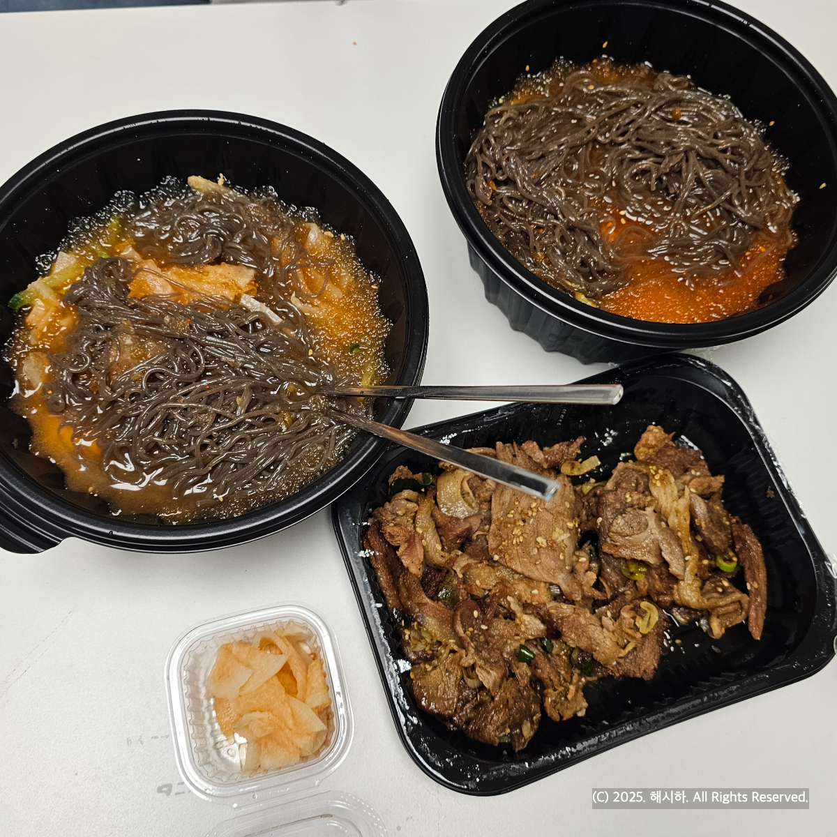이건 첫번째 주문인데 냉면이 먹고싶어서 남편은 해장물불냉면, 저는 칡물냉면과 바싹불고기를 시켰던 날이예요.