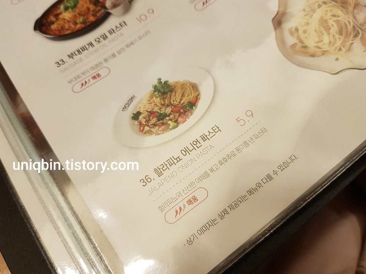 평소에는 크림파스타 또는 봉골레 크림 파스타를 즐겨먹지만, 이날은 조금 색다른 파스타가 먹고싶었습니다. 마침 라라코스트 입구에 신메뉴 소개가 되어있어서 골라 본 《할라피뇨 어니언 파스타》입니다.