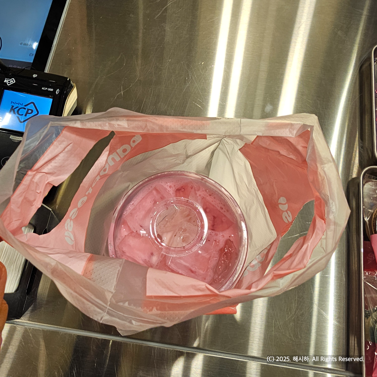 키오스크로 주문한 바나프레소 딸기라떼 나왔습니다.