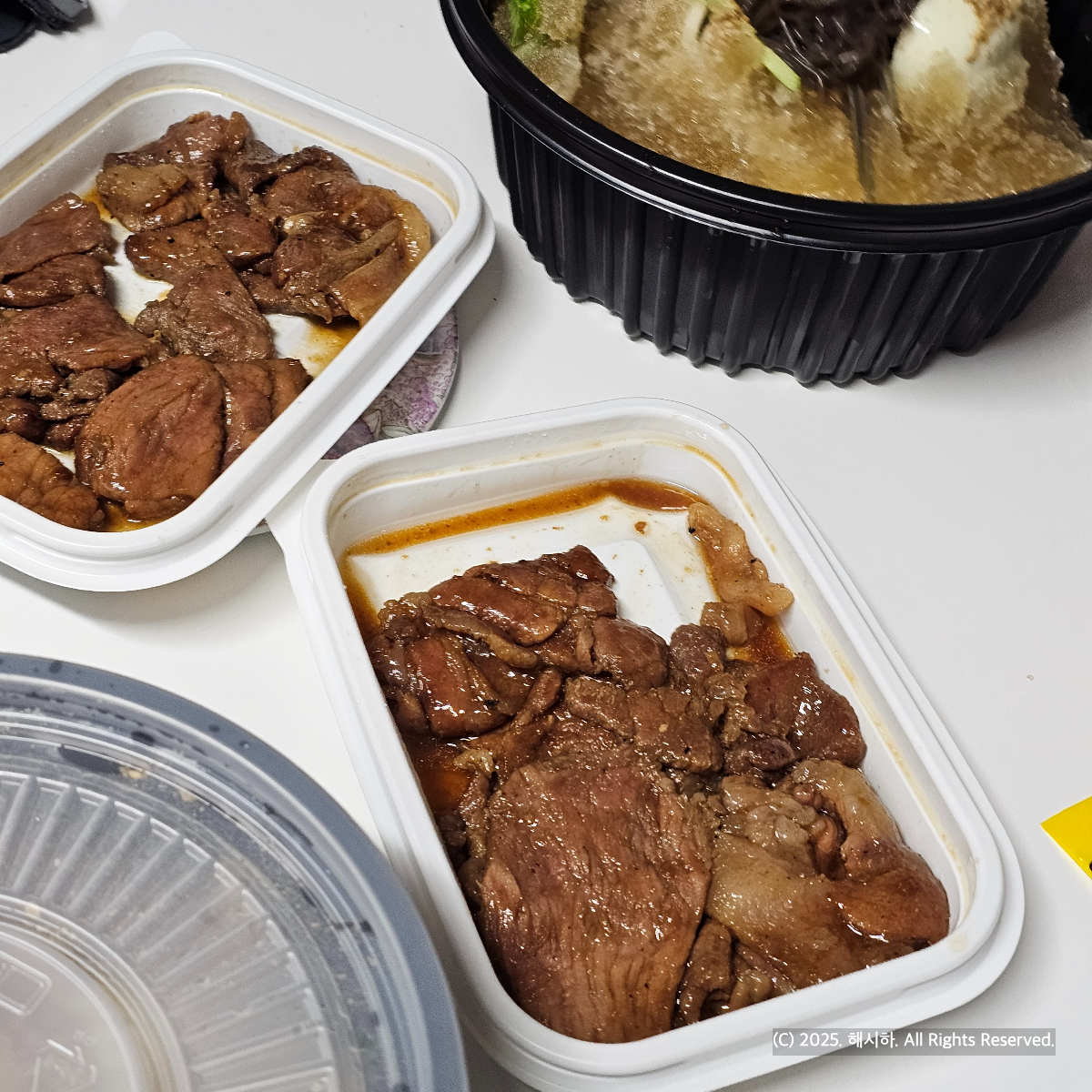숯불고기는 150g 2개라서 각각 ㅎㅎ 오...어느정도 두께감이 있어요.