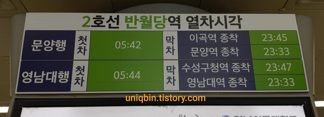 반월당역에서 보면 이렇게 열차시각이 나와있는데요. 이곡역 종착은 23시 45분이고, 문양역 종착은 23시 33분이라고 나와있습니다. 자, 여기서 저는 저 시간들이 이곡역이나 문양역에 도착하는 시간인지, 반월당에서의 출발시간인지가 헷갈린거예요.