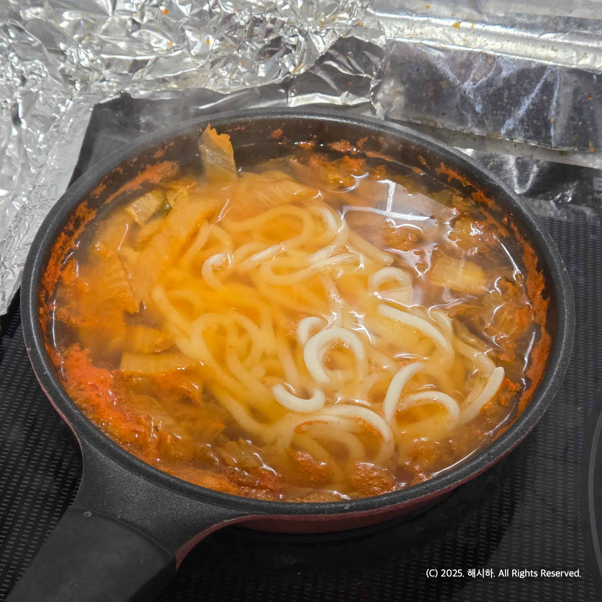500ml물에 우동소스와 맛김치를 넣어줘요.