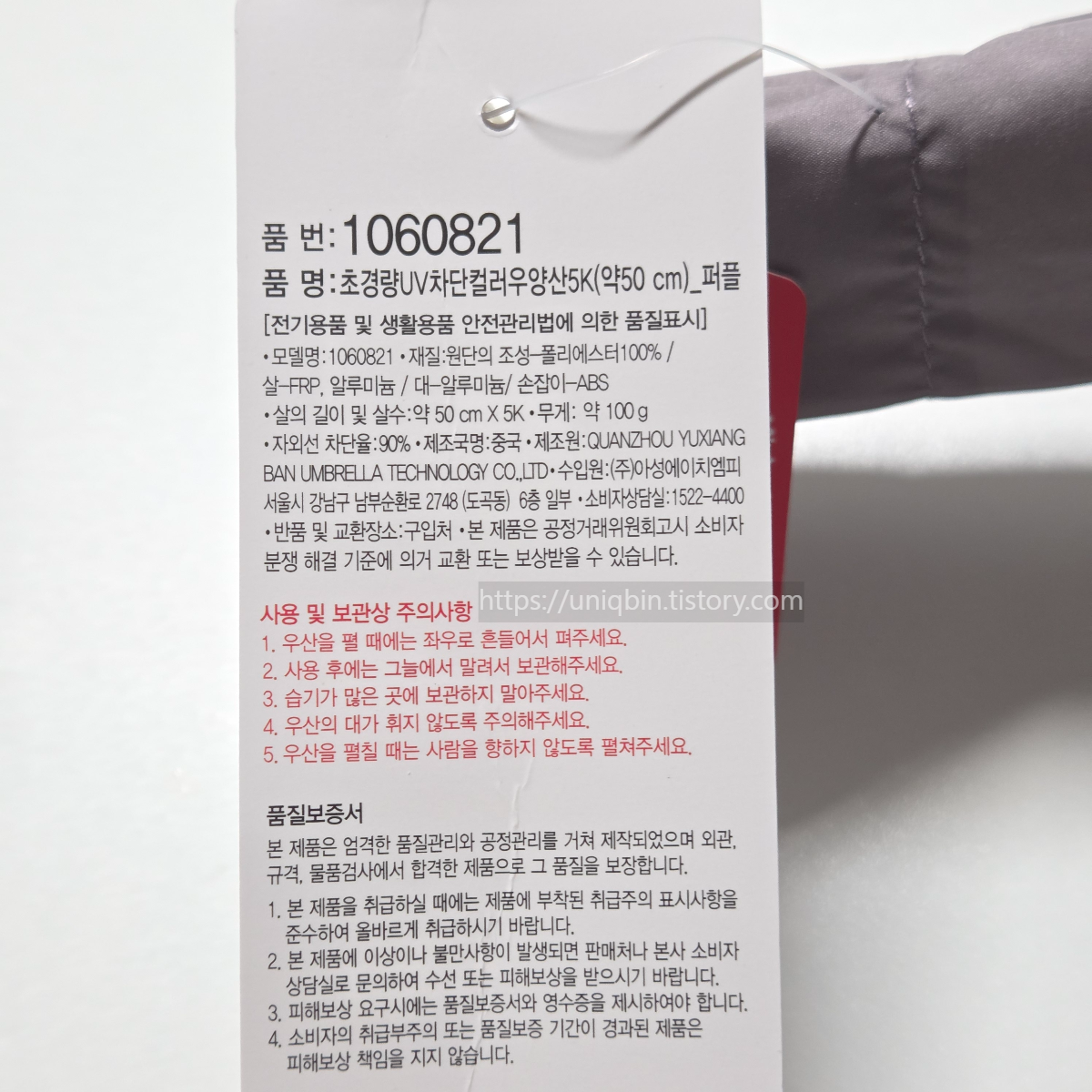 품명은 총경량 UV 차단컬러 우양산5K (약 50센티)퍼플.
