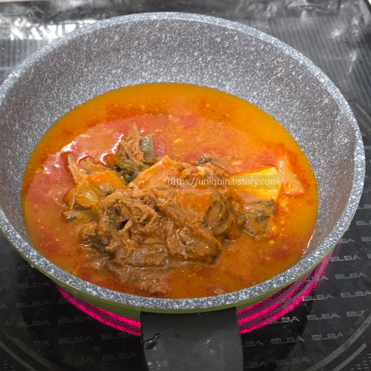 저는 보통 물을 소량 미리 하이라이트에 끓인후에 냄비가 달구어지면 부어요.