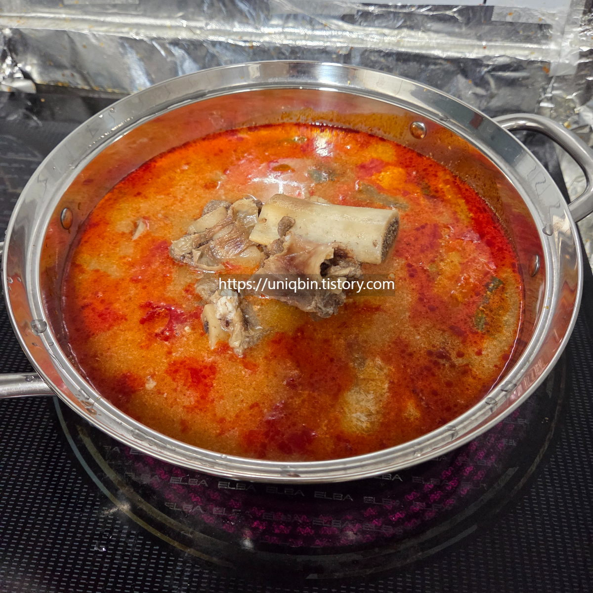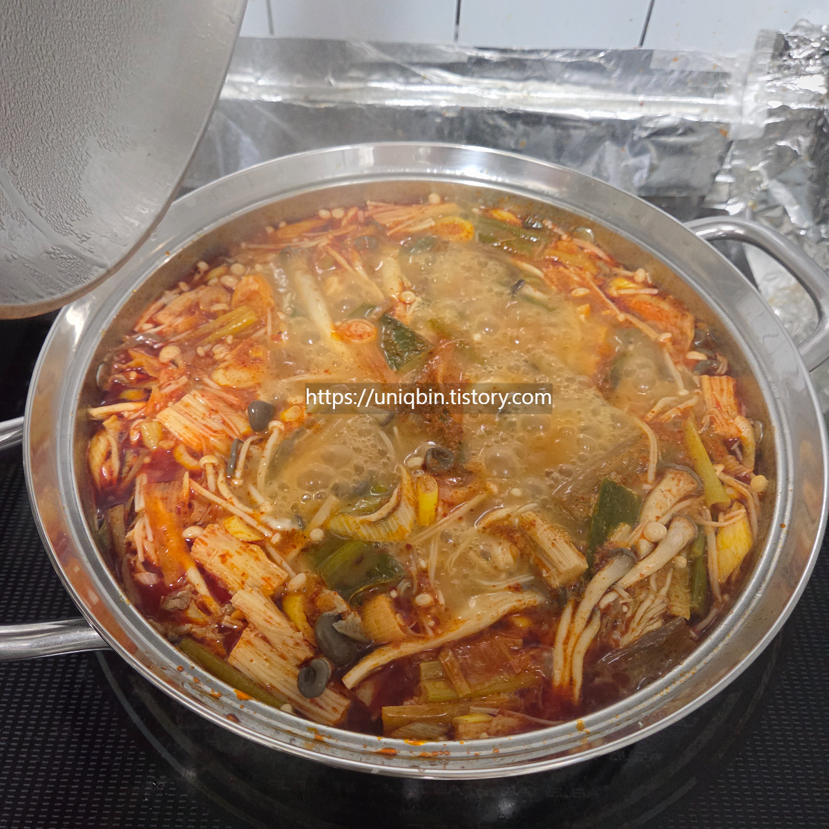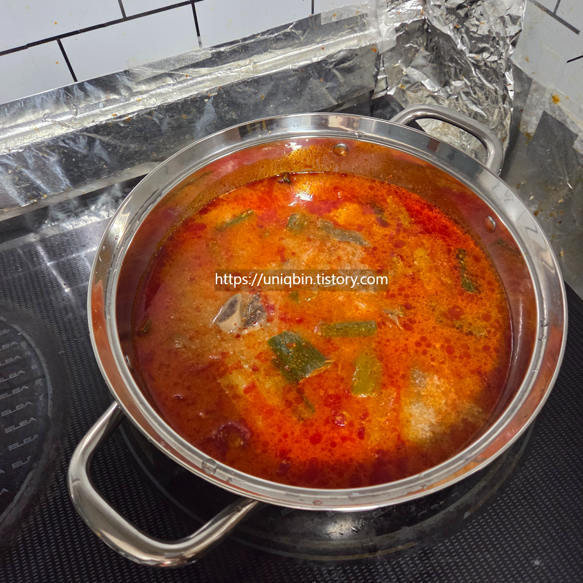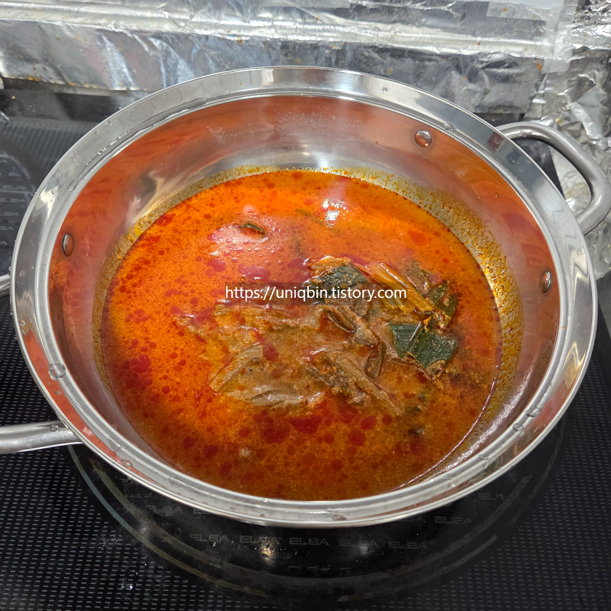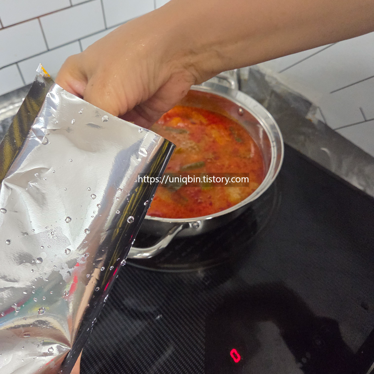 먼저 애초에 이렇게 만들어진 빨간육수팩을 한팩만 부어봤구요~