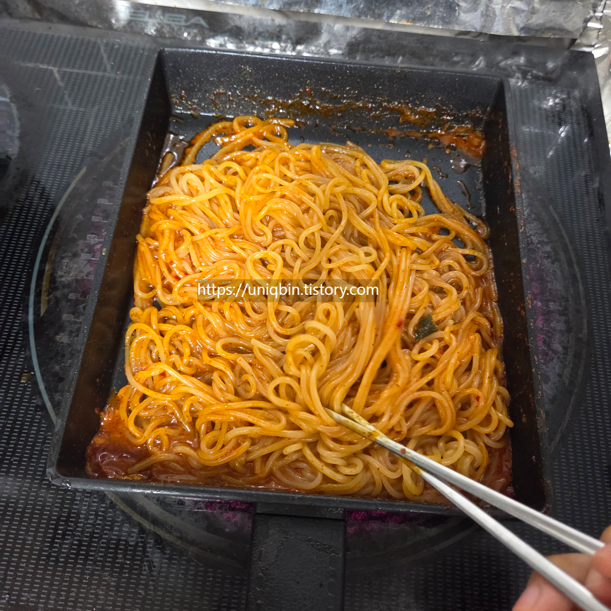 그리고 그 후라이팬 그대로에 기름좀 두르고 아까 찬물에 헹궈뒀던 쫄면넣구요!