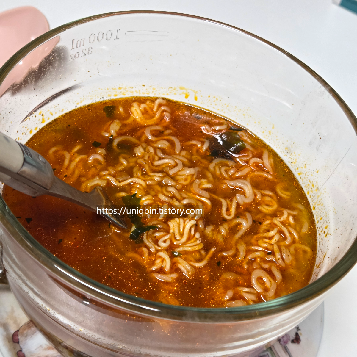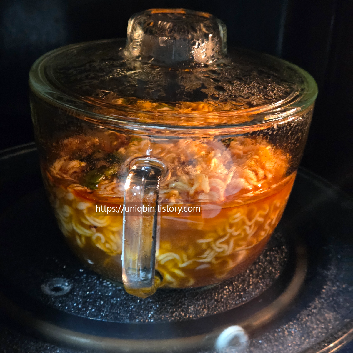 뜨거운물 400미리 붓고 전자렌지에 2분30초 돌려줬어요.