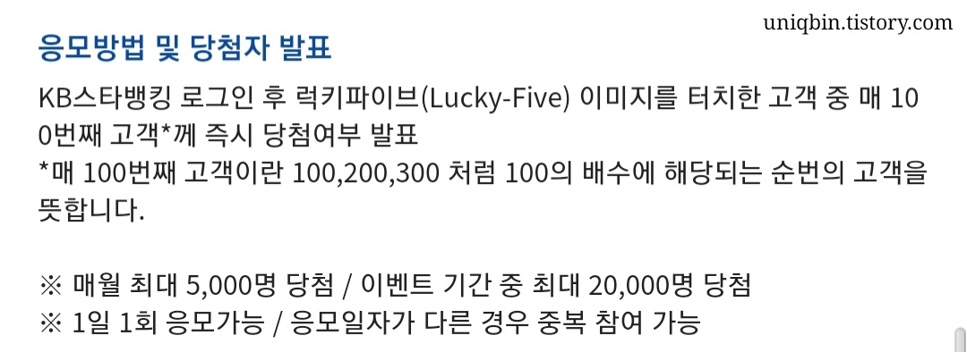 KB 스타뱅킹을 로그인하시고 이벤트 카테고리에서 'Lucky - Five 도전'을 클릭하시면 응모되는 방식인데