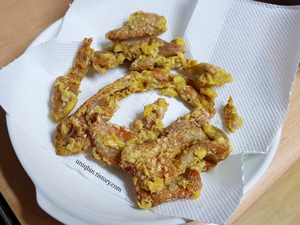 아무튼 그래서 다시 저기 위에 사진처럼 전분가루를 버무린 그상태로 넣어 기름에 튀겨봤어요. 요게 가장 치킨껍질 같은 맛이었는데,