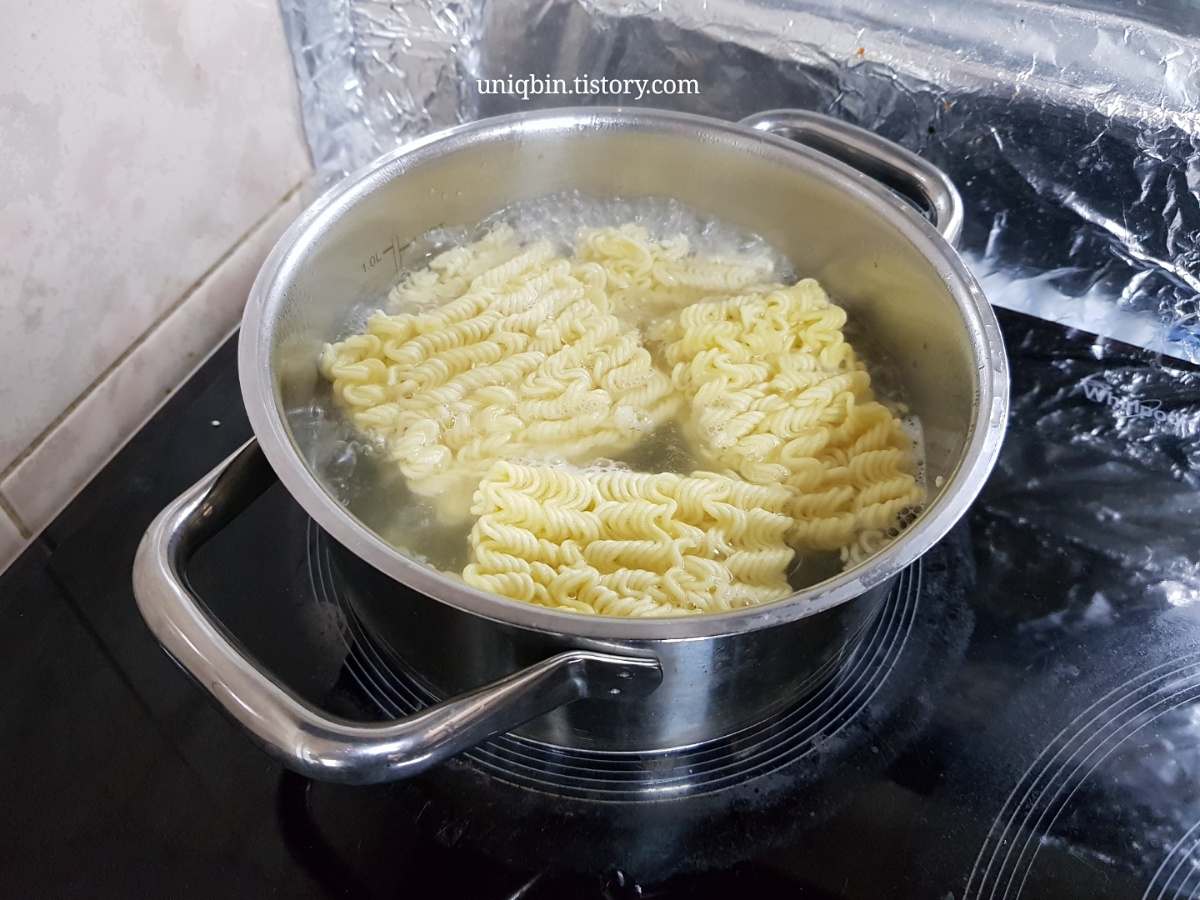 물 600ml를 넣고 끓인 후 면을 넣고 3분 30초간 더 끊입니다.