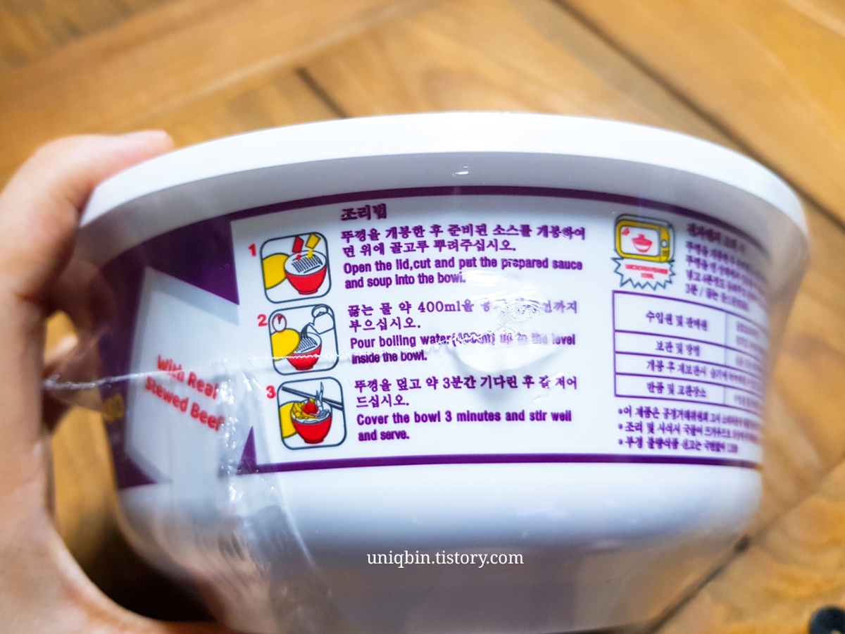 뚜껑을 열고 모든 소스를 부어, 끓는물 400ml를 표시선까지 붓고 약 3분간 기다리면 끝~