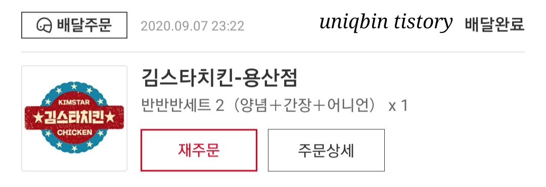 참고로 제가 시킨 곳은 대구 성서 용산점 김스타 치킨이예요~^^