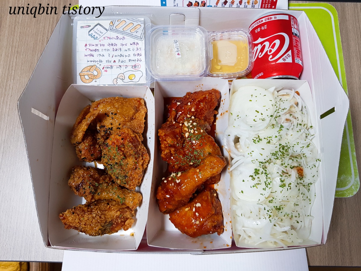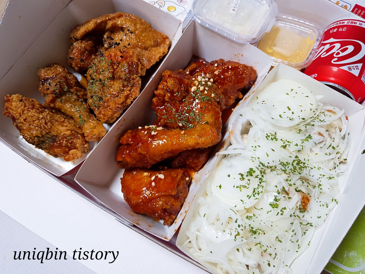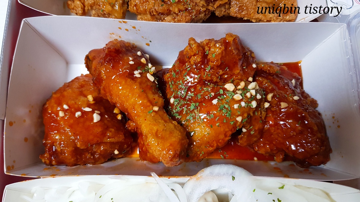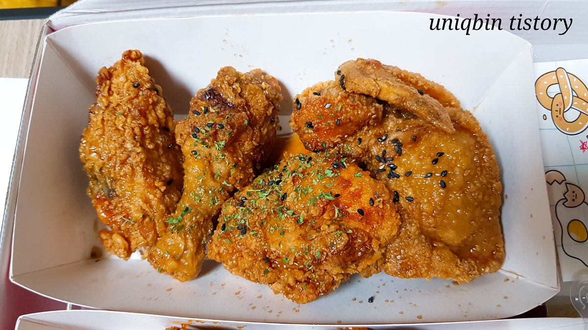 양념은 셋중엔 제일 무난..? 껍질이 마치 양념에 굳은듯 바삭한데 그렇다고 양념이 딱딱한것도 아니고 살은 부드럽고ㅋㅋ조화가 특이한데 많이 달지도 맵지도 않았던가 그래서(가물가물) 아이들이 먹기 좋은 양념맛이었을거예요.