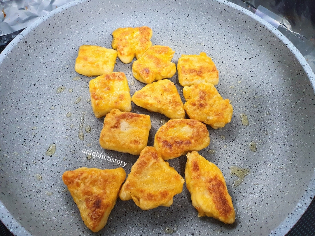 해동시켜서 기름두른 후라이팬에 올리고 노릇노릇 구워줍니다.