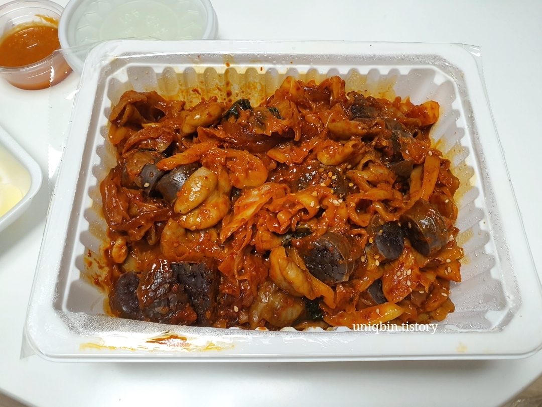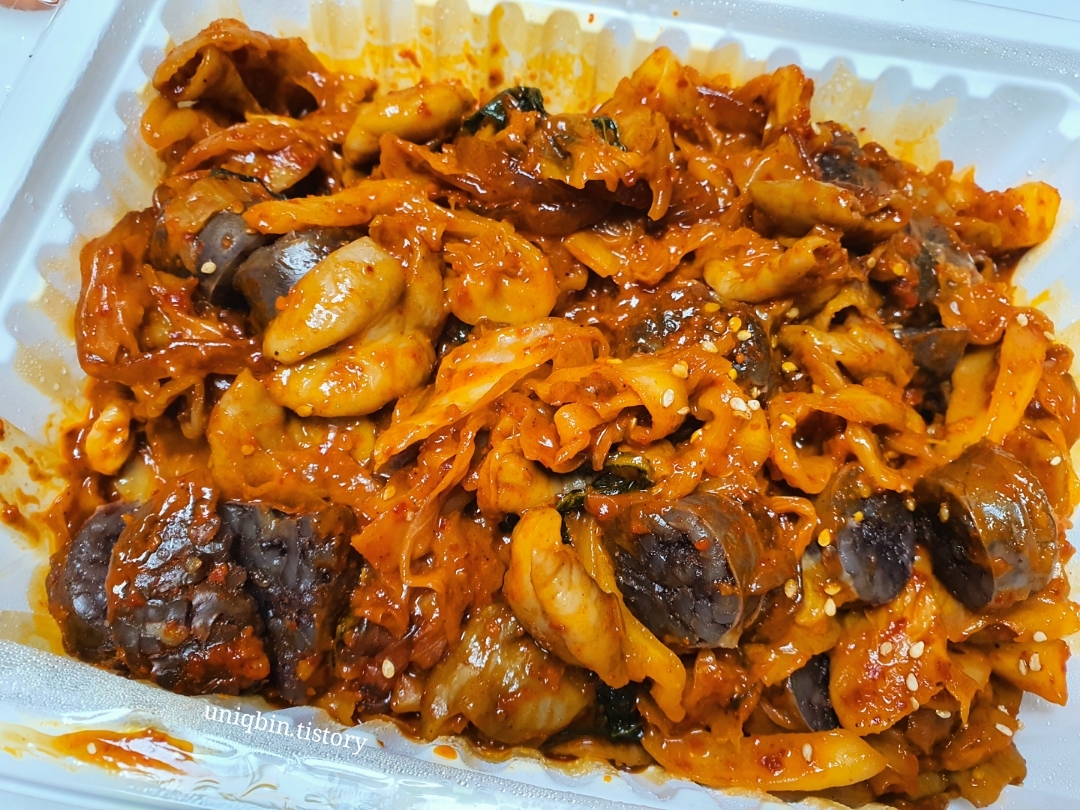 곱창 야채볶음인데 순대도 들어있고 떡도있어요.