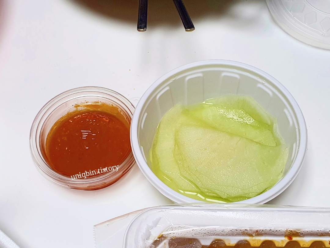 보정하다 보니 색이 이상한데 우리가 아는 연두색 쌈무 예요. 닥치고 곱창의 장점은 딸려오는게 심플하기에 뒷처리가 편해요. 그래서 맛도 맛이지만 피곤한 저녁에 시켜먹을 곱창으로 매우 좋아요.