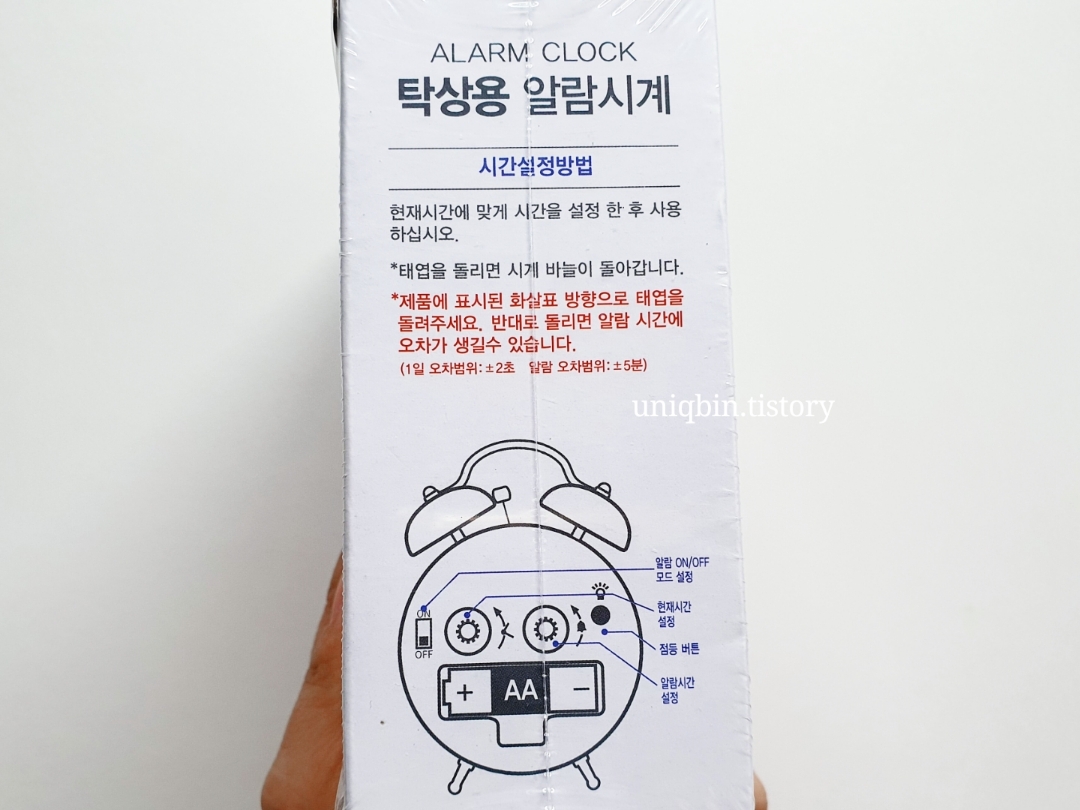 이 다이소 알람시계는 AA타입의 건전지 하나가 들어가고 간편히 쓸 수 있는 구성이예요.