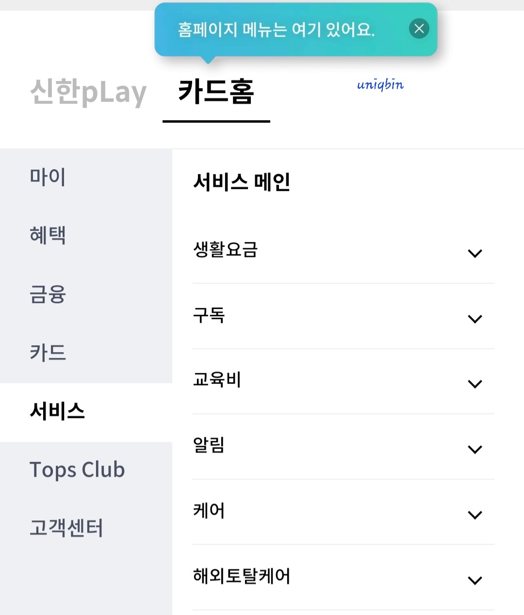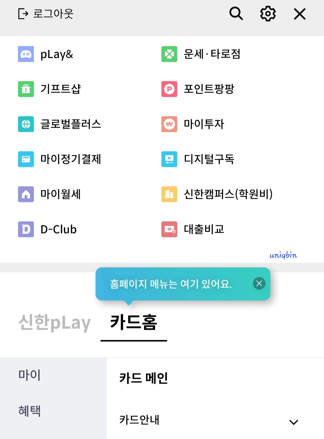 그리고 스크롤을 내려서 카드홈이 회색으로 뜰때가 있을텐데요. 신한pLay에서 상단 카드홈 부분을 눌러줍니다.